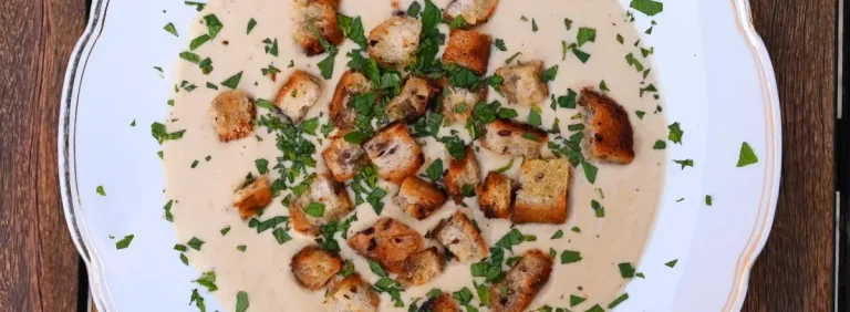 Tortilla in Streifen schneiden, in Öl braten. Brühe, Avocado, Sahne und Sherry erhitzen und zermixen, Tortilla darübergeben.