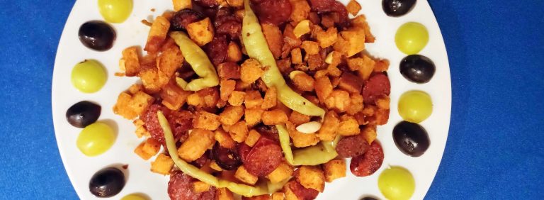 Gestriges, also nicht zu trockenes, Weißbrot würfeln. Vegane Chorizo (oder andere vegane Wurst plus Paprikapulver) in reichlich Olivenöl braten. Das Brot zugeben und am Ende reichlich Knoblauch und eingelegte Peperoni (vorher ausdrücken). Mit (kernlosen) Trauben servieren.