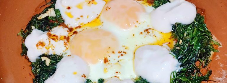 Sehr viel Rucola scharf in Olivenöl anbraten, wenig salzen. Ein Nest formen, Eier hineinschlagen, mit Deckel 5-6 Min. stocken lassen. Butter mit Paprika und Chiliflocken erhitzen. Joghurt mit Knoblauch und Salz verrühren. Beides darüber geben. Mit Brot servieren.