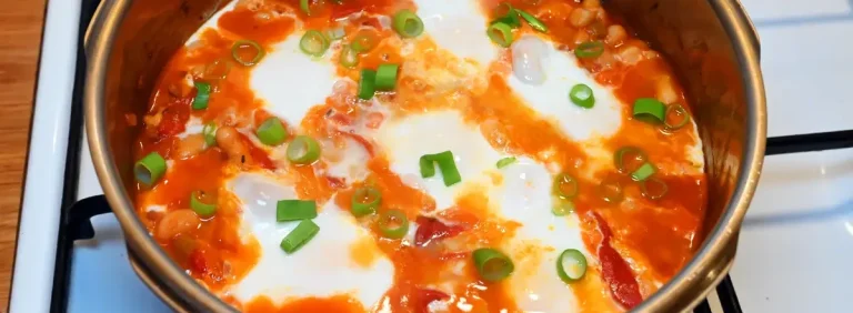 In Olivenöl Kreuzkümmel, Frühlingszwiebeln und Knoblauch anbraten. Dosenbohnen, Nudelsauce und eingelegte Paprika darin erhitzen. Mit dem Löffel Dellen drücken und Eier hineinschlagen. Mit Deckel 4-5 Min. garen. Mit Pide servieren.