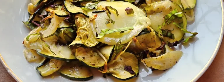 Zwiebeln und Knoblauch, dann Zucchinischeiben und Petersilie braten. Runde Ziegenkäse darauflegen und mit Deckel garen.