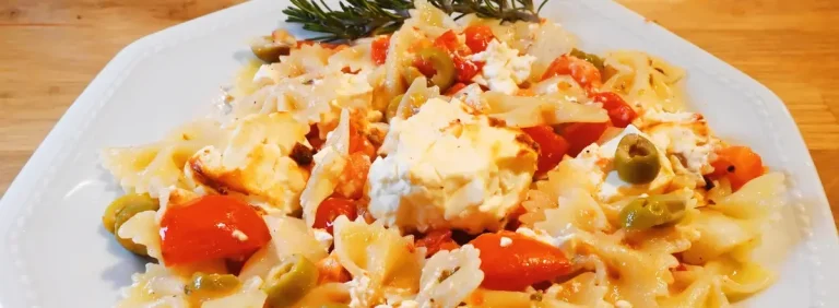 Im Ofen Feta 20 Min. backen. Dicke Pasta kochen. Nach der halben Backzeit Kirschtomaten, Knoblauch und Olivenöl zugeben. Mit den abgetropften Nudeln vermischen.
