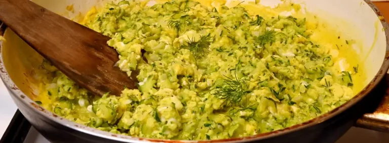 Eier mit geraspelten Zucchini, Knoblauch, Olivenöl, Milch und Petersilie verquirlen und unter ständigem Rühren braten.