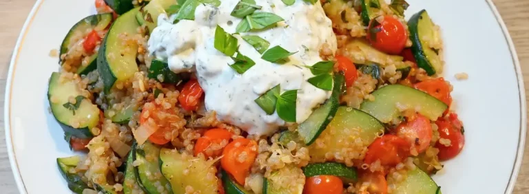 Zwiebeln, Zucchini und vorgekochtes Quinoa braten, gegen Ende Tomaten zugeben. Darauf Ziegenfrischkäse oder Joghurt geben sowie frische Kräuter.