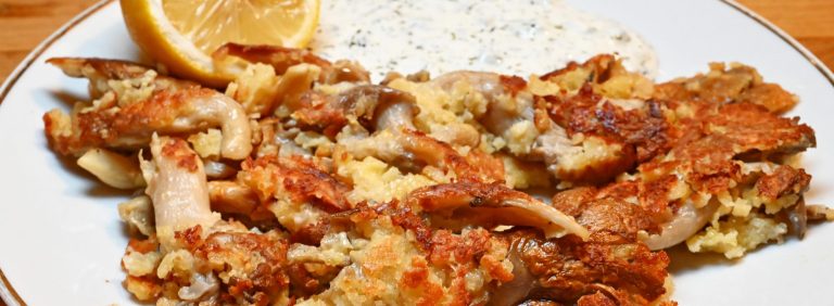 Austernpilze (viele, da sie sehr schrumpfen; größere in dicke Streifen schneiden) in einer Schüssel mit Mehl bestäuben. Erst verquirlte Eier und Parmesan unterrühren, dann Panko-Paniermehl. In einer großen Pfanne braten und dabei mehrfach wenden. Mit Zitronenschnitzen und Zaziki servieren.