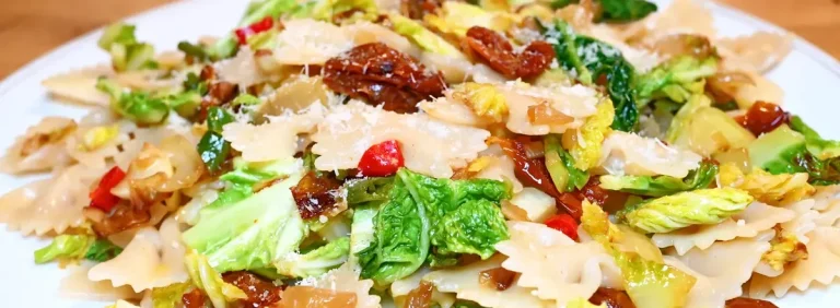 Dicke Pasta kochen. Zwiebeln, Knoblauch, Peperoni, kleingeschnittenen Wirsing und getrocknete Tomaten braten. Zu den Nudeln geben, mit Parmesan servieren.